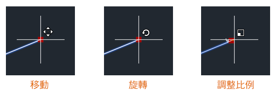 掣點是顯示在所選物件上的小方形、矩形和三角形。您可以使用掣點拉伸、移動、複製、旋轉、調整比例和鏡射物件,而無需輸入任何指令。
