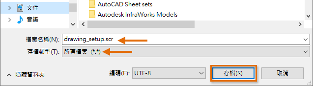 在「檔名」文字方塊中,選取預設文字並鍵入 drawing_setup.scr 。