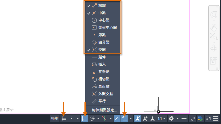 將常駐式物件鎖點設定為「端點」、「中點」和「交點」