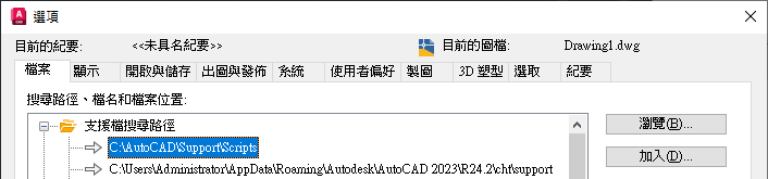 註: 您可以在「選項」對話方塊 (OPTIONS 指令) 的「檔案」頁籤上,管理 AutoCAD 支援檔搜尋路徑設定的資料夾。如需將資料夾加入 AutoCAD 支援檔搜尋路徑設定的資訊,請參閱