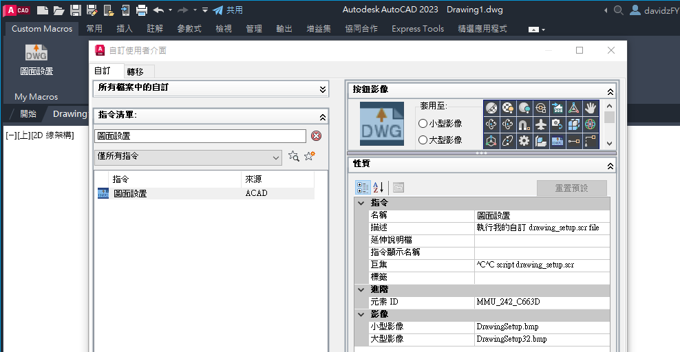 使用 SCRIPT 指令可以定義巨集,以從功能區按鈕執行特定腳本。以下是啟動 SCRIPT 指令並執行名為 drawing_setup.scr 之腳本檔的巨集內容: