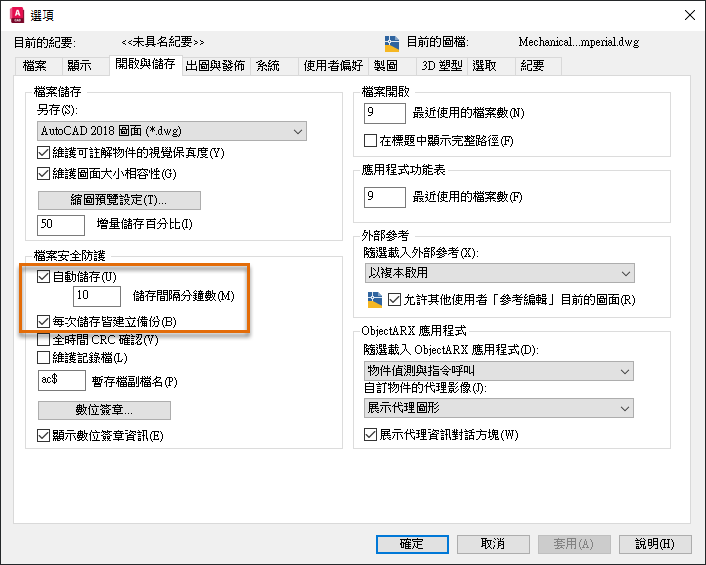 下列步驟說明如何在「選項」對話方塊中變更「圖面備份」和「自動儲存」功能設定,控制在您處理圖面時 BAK 和 SV$ 檔的建立: