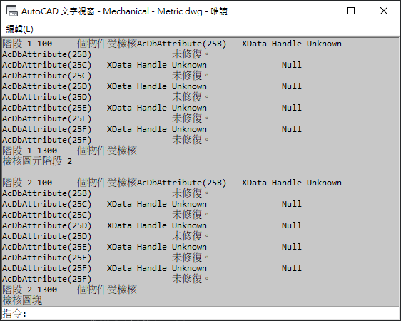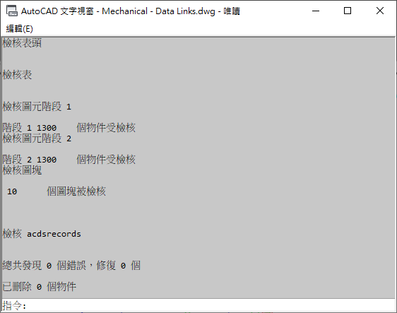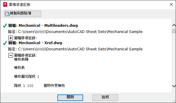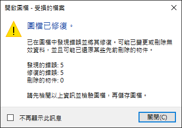 如果您開啟的圖面包含錯誤,則會顯示找到並修復的錯誤數,以及由於無法修復而刪除的物件數。