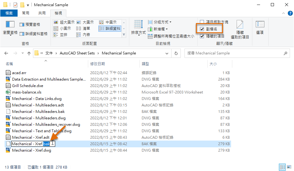 下列步驟說明如何在 Windows 中變更 BAK 或 SV$ 檔的副檔名: