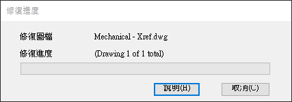 螢幕上將顯示「修復進度」訊息方塊,並通知您貼附至圖面的外部參考檔案的檢核進度。