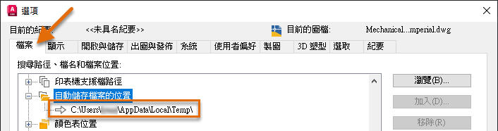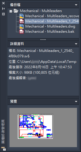 當您處理圖檔時,AutoCAD 會建立兩種其他類型的檔案。如果圖面損壞,或您的程式在變更儲存之前意外關閉,這些其他檔案有助於還原圖檔。依預設,AutoCAD 會在處理圖面時建立以下其他類型的檔案: