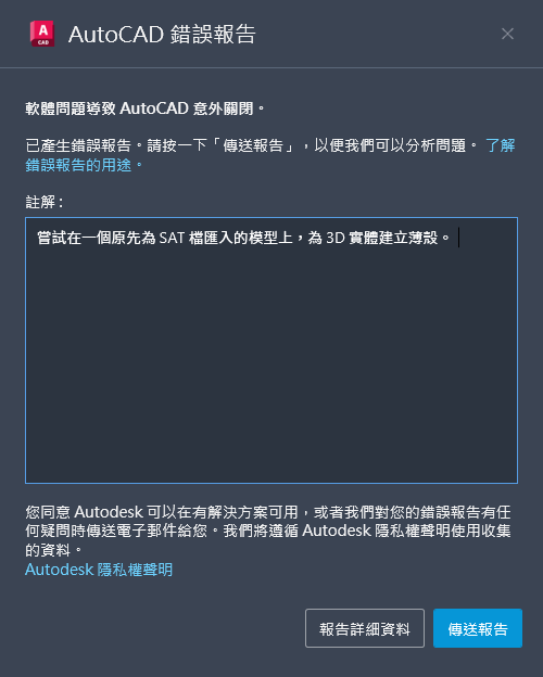 儲存任何開啟的圖面時,如果有未儲存的變更,應該會顯示「AutoCAD 錯誤報告」對話方塊。在此對話方塊中,您可以傳送錯誤報告給我們。錯誤報告包括有關程式和工作站目前狀態的資訊,並可包括選擇性資訊,例如您在發生錯誤時所執行的作業。錯誤報告用於改善產品的穩定性。