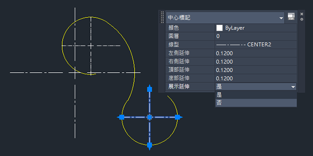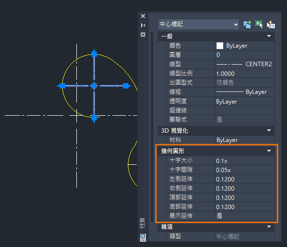 也可以使用「性質」選項板變更性質。顯示「性質」選項板後,選取要檢視的中心標記或中心線,然後變更性質,例如「顏色」、「十字大小」、「十字間隙」、「延伸長度」等。