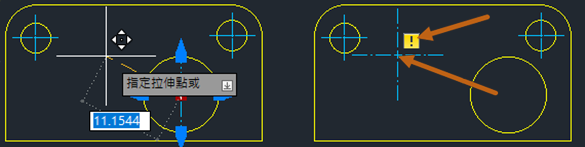 中心標記和中心線也可以使用掣點進行編輯。將游標懸停在掣點會顯示延伸線的動態標註。