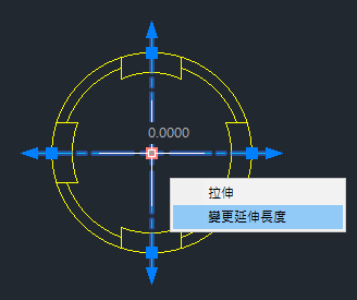 將游標懸停在中心標記的多功能中心掣點上會顯示功能表。您可以在此處拉伸以移動中心標記,以及統一變更所有四條中心線延伸的長度。