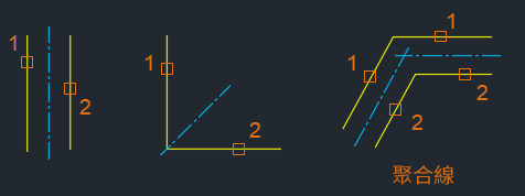 線段可以平行,也可以成某個角度。線段也可以彼此交叉甚至互垂,從互垂交點產生一條 45 度的中心線。