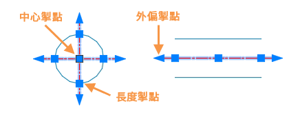 掣點可讓您直接操控中心標記和中心線。在此範例中,中心線分別經過修改。當拖曳「長度」掣點時,它會調整中心線的長度,中心線延伸也會隨之移動。拖曳「外偏位量」掣點只會變更中心線延伸。