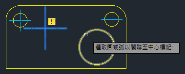 中心標記和中心線有一些與標註相同的關聯式性質。如果刪除標註測量的幾何圖形,標註會取消關聯。與標註類似,當中心標記或中心線變成取消關聯,且註解監控處於作用中時,您會在中心標記或中心線旁看到黃色徽章。