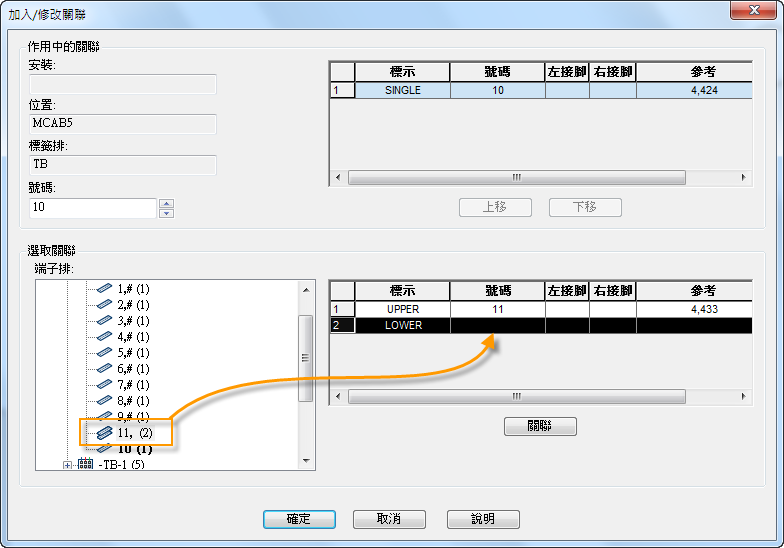 如果端子不在同一圖面中,可編輯您想與其他端子關聯的端子。選取「加入/修改」按鈕可開啟「加入/修改關聯」對話方塊。從該對話方塊中,您可以將端子插入到其他端子上的開放層。