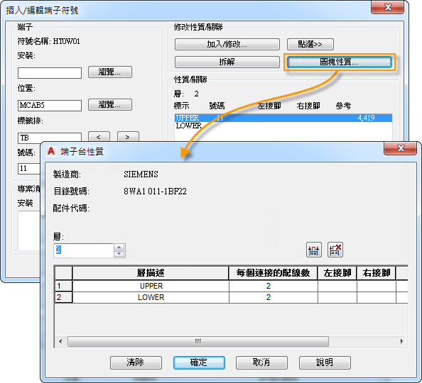 線路圖端子符號可以表示單層端子或多層端子的一層。端子的層數定義為圖塊性質。每一層均包含某些特性,例如標示、每個連接的配線數、左接腳和右接腳。每個線路圖端子符號均包含每一層的所有圖塊性質,以便移除一個端子符號時不會移除圖塊性質。如果修改圖塊性質,則所有端子符號會進行更新。沒有任何層性質的符號會被視為單層端子。端子性質可以是目錄指定的一部分,並在指定目錄時自動套用。