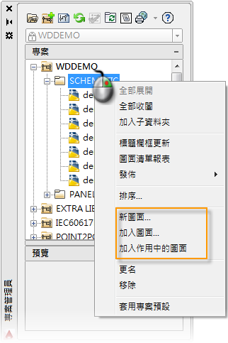 可隨時將既有圖面加入至作用中的專案。如果您想重複使用先前專案中的圖面,此功能很有用。若要在特定資料夾中加入或建立圖面,請在「專案管理員」中的資料夾名稱上按一下右鍵,然後選取圖面選項。