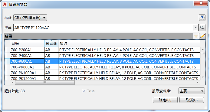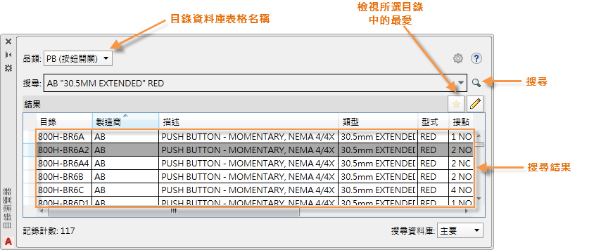 如果您擁有專案的元件清單,並已知道零件號碼,則可從目錄資料庫中選取以插入元件。使用「目錄瀏覽器」選項板,從目錄資料庫插入元件。 查找