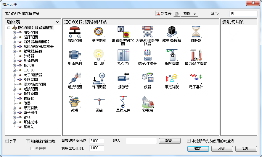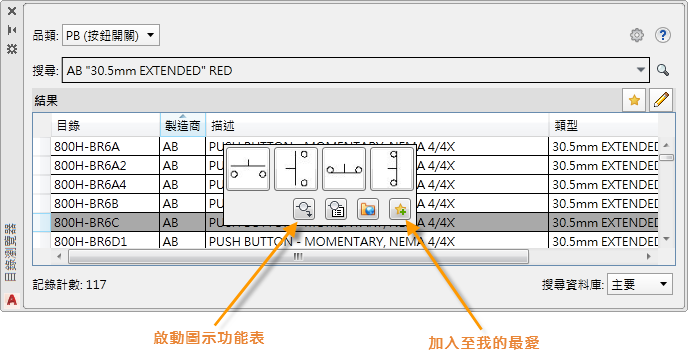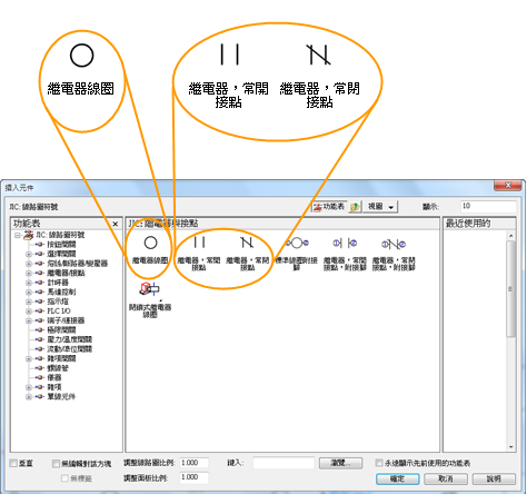 圖示功能表可讓您選取符號類型來插入符號,例如常開按鈕或三段選擇開關。插入符號後,您可以使用描述、目錄資訊等進行註解。