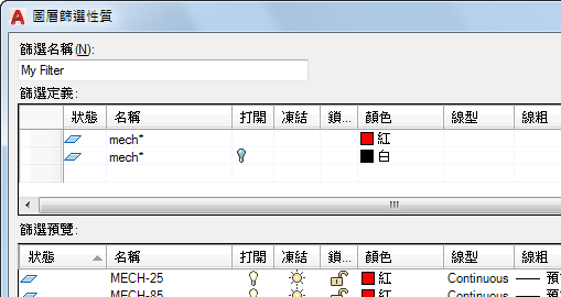 在此範例中,圖層性質篩選包含以「mech」開頭的紅色圖層,或以「mech」開頭的白色關閉圖層。