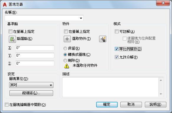 指定要併入新圖塊的物件,以及是否要保留或刪除選取的物件,或者是否在建立圖塊之後將它們轉換成圖塊例證。