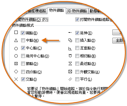 輸入 OSNAP 指令以設定預設物件鎖點,這也稱為「執行」物件鎖點。例如,您可能會發現其有助於依預設打開「中點」物件鎖點。