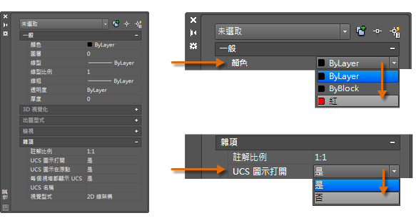 「性質」選項板可顯示所有重要性質設定清單。您可以按一下任何可用欄位以變更目前設定。在以下範例中,如果未選取任何物件,目前的顏色會從「依圖層」變更為「紅」,且 UCS 圖示將會關閉。