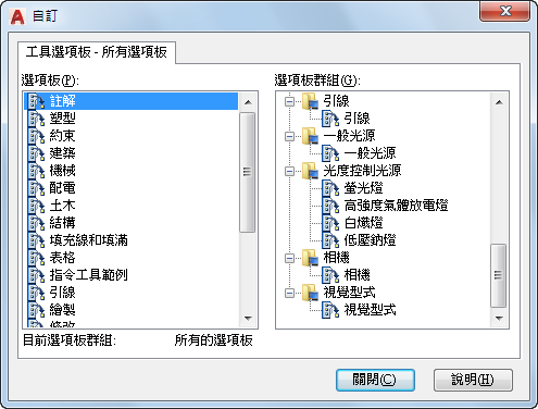 由於工具選項板群組於刪除後便無法加以修復,因此如果您想要在稍後存取工具選項板群組,可以先將工具選項板群組匯出成 XPG 檔。
