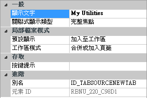 在樹狀視圖中選取新功能區頁籤,並更新「性質」窗格: