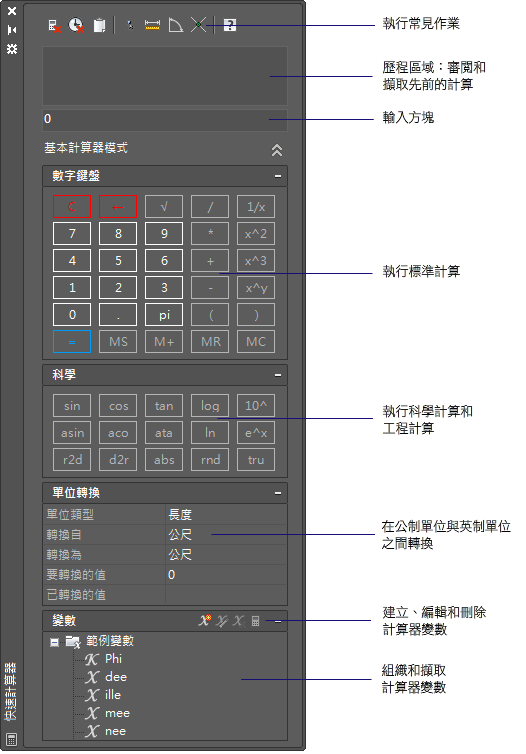「快速計算器」除了科學計算器的基本功能之外,還包含幾何函數、單位換算和變數的功能。