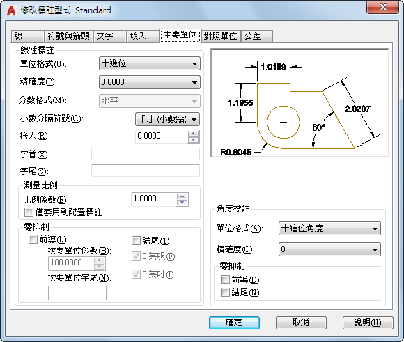 設定主要標註單位的格式和精確度,以及設定標註文字的字首和字尾。
