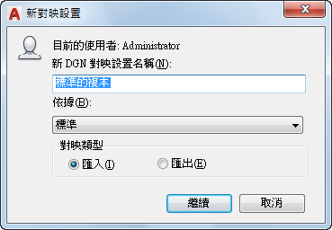 開啟「修改 DGN 對映設置」對話方塊。根據選取的貼圖類型 (匯入或匯出),會顯示相應的匯入/匯出對話方塊。