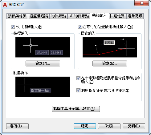 控制指標輸入、標註輸入和動態提示,以及製圖工具提示的外觀。