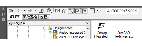 「設計中心」提供一種方法可快速尋找內容,例如圖檔、圖塊定義,以及填充線。