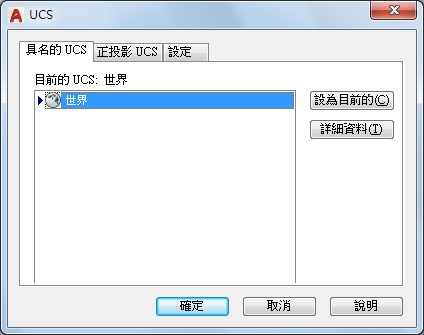 顯示提供有 UCS 座標資料的「UCS 詳細資料」對話方塊。