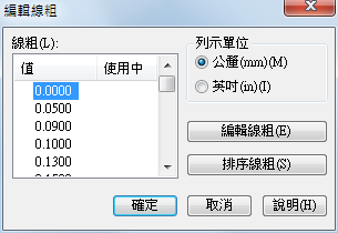 列示出圖型式表中的線粗。您可以修改既有的線粗,但無法加入或刪除它們。如果變更線粗值,使用該線粗的其他出圖型式也會隨之變更。