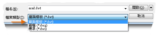 若要修改既有圖面樣板檔,請按一下「開啟」,在「選取檔案」對話方塊中指定「圖面樣板 (*.dwt)」,然後選擇樣板檔。