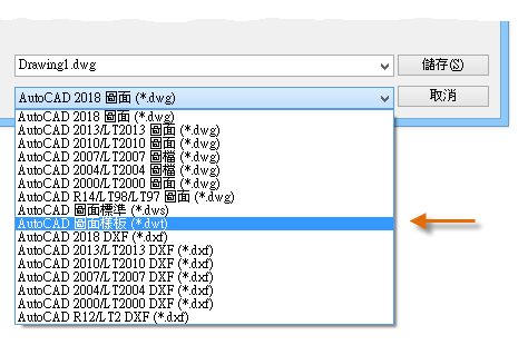 您可以將任何圖面 (.dwg) 檔儲存成圖面樣板 (.dwt) 檔。您也可以開啟任何既有圖面樣板檔並進行修改,然後在需要時使用不同檔名再次儲存。