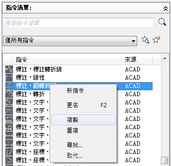 - 在「自訂」頁籤的「指令清單」窗格中,尋找您要複製的指令。