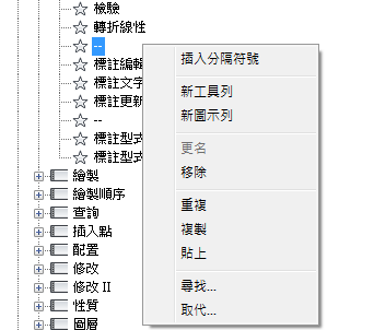 注意: 移除指令後無法退回。如果意外地移除錯誤的指令,請按一下「取消」以結束 CUI 編輯器。按一下「取消」將不會儲存所有 CUI 編輯器中的變更,因為它已開啟或已套用最後一次變更。