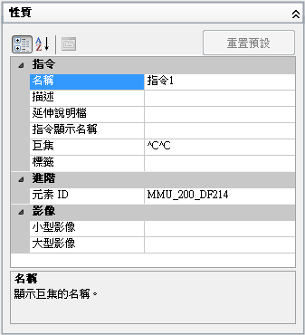 - 在「名稱」方塊中,輸入指令的名稱。加入至使用者介面元素後,該值會做為預設名稱,以及提示的一部分。
