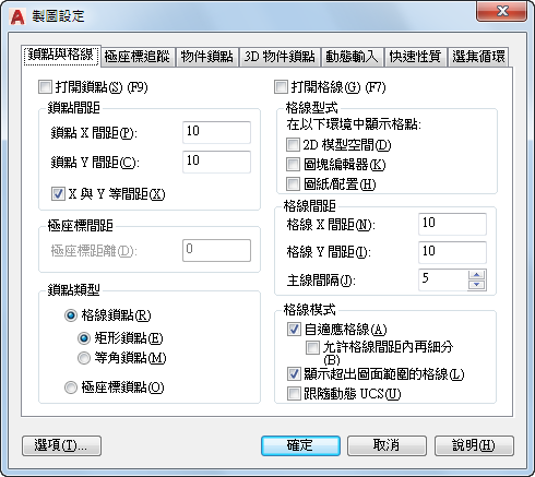 設定 2D 介面環境中的格線型式。也可以使用 GRIDSTYLE 系統變數設定格線型式。
