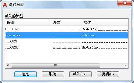 顯示「載入或重新載入線型」對話方塊,您可以在其中將選取的線型載入圖面,然後將它們加入到線型清單中。