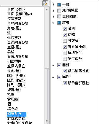 如果已勾選某個物件類型,在選取相同類型的物件時,以及 QPMODE 設定為 2 且 PICKFIRST 開啟時,則會在「快速性質」選項板上顯示該物件類型的性質。清除物件類型旁邊的勾選標記可以從「快速性質」選項板移除所選取的物件類型。