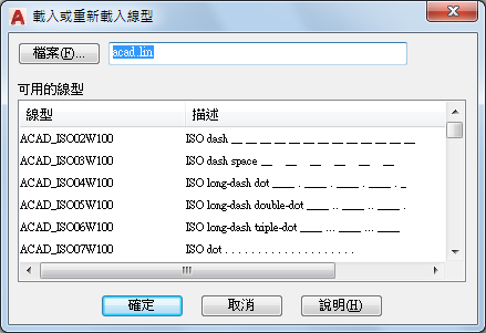 顯示「選取線型檔」對話方塊,您可在其中選取不同的線型 (LIN) 檔。
