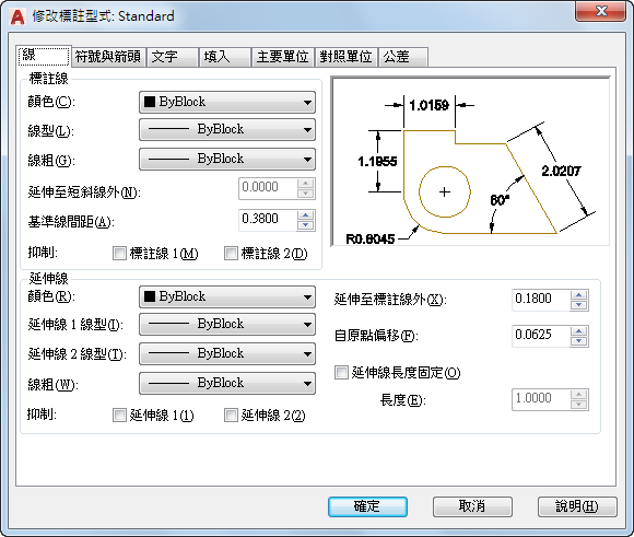 設定標註線、延伸線、箭頭和中心標記的格式和性質。