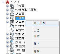 新工具列 (被命名為「工具列1」) 會置於「工具列」樹的底部。