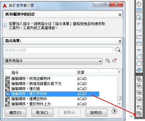 「指令清單」窗格僅會顯示工具列控制元素的清單。