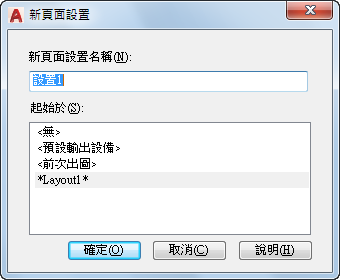 如果您從「圖紙集管理員」開啟「新頁面設置」對話方塊,則僅列示替用頁面設置檔案中的具名頁面設置。