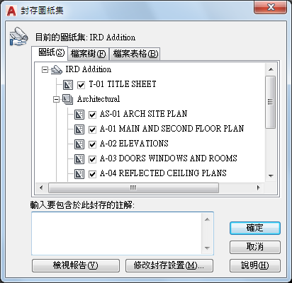「圖紙」頁籤將按照圖紙順序並根據子集組織,列示封存套件中要包括的圖紙。「檔案樹」頁籤將以階層式樹狀格式,列示套件中要包括的檔案。「檔案表格」頁籤將以表格格式,顯示套件中要包括的檔案。