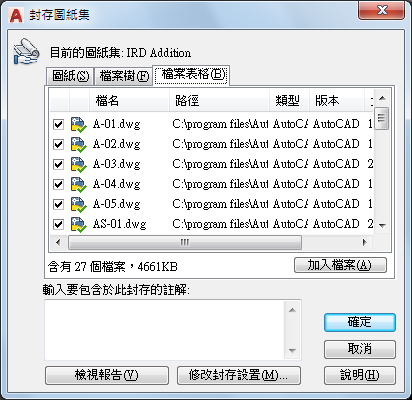 使用表格格式顯示要併入封存套件中的檔案。依預設,目前圖面的所有相關檔案 (如相關的外部參考、出圖型式和字體) 都會列出。您可以將檔案加入封存套件,也可以移除既有的檔案。URL 所參考的相關檔案不會併入封存套件。